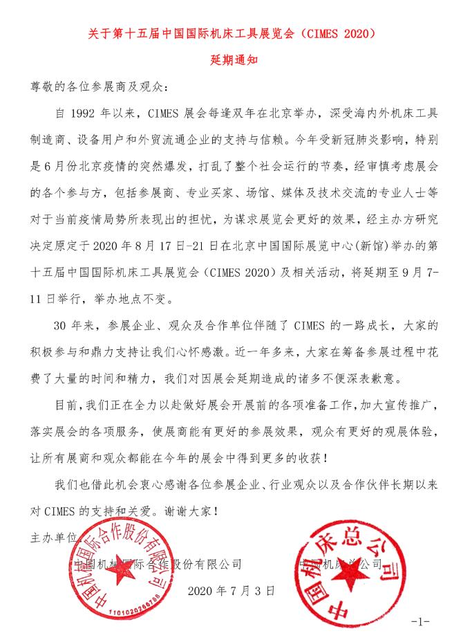官宣 | 9月7-11日,與您相聚第十五屆中國國際機床工具展覽會(CIMES 2020)