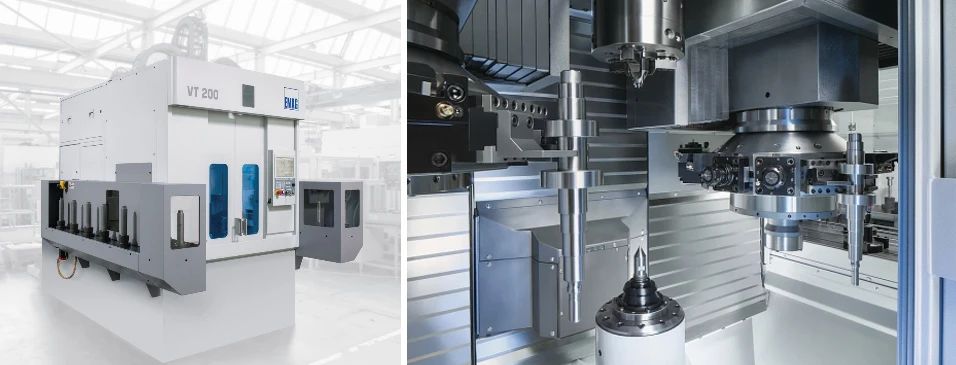 EMAG的倒立車的單機自動化程度高,這次展會展出的VT200雙刀架軸類立式車床,集成了帶工件架的鏈式輸送帶,通過集成在兩個刀塔上的機械手從工件傳輸帶上抓取毛坯件,并垂直送入車床中,完成加工后,通過另一個刀架上的機械手將工件取出,實現(xiàn)單機自動化上下料。