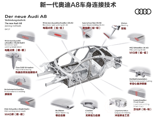 (一圖看懂新一代奧迪A8車身連接工藝,點(diǎn)擊查看大圖 - 圖片來自奧迪官網(wǎng),AMTS翻譯)