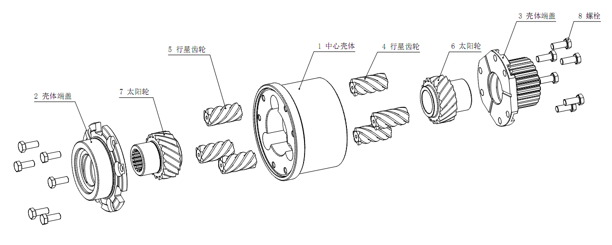 該圓柱螺旋齒式限滑差速器由三組齒輪同一公轉軸線平均布置。在左右兩側,每個行星齒輪分別和各自的輸出太陽輪嚙合,每對行星齒輪在中間部位相互嚙合,同時,兩個太陽輪之間是有間隙的,不和對面的行星齒輪嚙合。