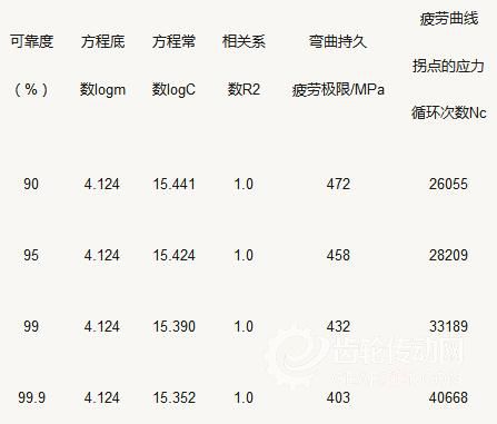 齒輪在各種可靠度時的極限應力值是根據齒輪疲勞試驗所得的應力壽命樣本,經過分析處理得到的,本試驗的數據處理原則上是按GB/T14230和GB/T24176所給的方法進行的。為了更精確計算,短壽命區采用了三參數威布爾分布來描述齒輪壽命的離散性,長壽命區的疲勞極限強度分布按正態分布處理,齒輪彎曲疲勞曲線傾斜段方程(在對數坐標中為直線方程)的形式為mlogσFlim+logN=logC,式中N為應力循環次數(即壽命),σFlim對應于N的疲勞極限,m為方程指數,C為方程常數。