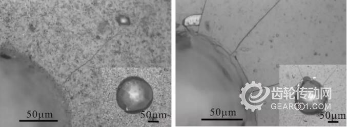 圖2為AlTiCrN-DLC涂層斷口形貌。由圖可知,AlTiCrN膜層厚度約為3.5μm;DLC膜層厚度約為2.5μm,且表現(xiàn)出典型的非晶態(tài)結(jié)構(gòu)。膜基結(jié)合力對摩擦磨損試驗及切削試驗結(jié)果有一定的影響,因此,在進行相關(guān)試驗前,對AlTiCrN涂層和AlTiCrN-DLC涂層分別進行了膜基結(jié)合力試驗,涂層壓痕形貌見圖3。由圖可知,AlTiCrN涂層壓痕周圍僅有部分微裂紋,AlTiCrN-DLC涂層壓痕周圍有部分脫落和裂紋,其結(jié)合力明顯低于AlTiCrN涂層。根據(jù)壓痕測試標準(VDI 3198)對照標準壓痕等級示意圖,AlTiCrN涂層和AlTiCrN-DLC涂層壓痕等級分別為HF1和HF3,均達到了涂層使用標準。