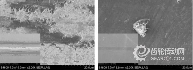 為了探究AlTiCrN和AlTiCrN-DLC涂層刀具的磨損機理,對切削速度50m/min條件下,切削長度分別為30m和60m時涂層刀具的后刀面磨損形貌進行了分析,如圖8和圖9所示。