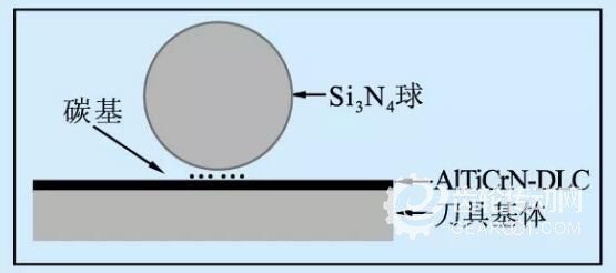 當溫度達到400℃時,DLC涂層刀具表現(xiàn)為金剛石相的sp3鍵會轉(zhuǎn)化為石墨相的sp2鍵,由于DLC膜層與AlTiCrN膜層之間的熱膨脹系數(shù)差異較大,兩膜層之間也會存在產(chǎn)生內(nèi)應(yīng)力和熱裂紋的可能,導(dǎo)致DLC膜層開裂和脫落。