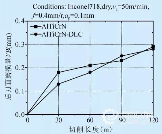 AlTiCrN和AlTiCrN-DLC涂層刀具在切削速度50m/min條件下切削Inconel718時的后刀面磨損量見圖7a。由圖可知,切削長度0-60m范圍內(nèi),DLC潤滑層的作用明顯。一方面,由于摩擦系數(shù)較低,降低了刀具與工件之間的摩擦系數(shù),同時降低了刀具后刀面磨損;另一方面,DLC中的石墨相和切削過程中金剛石在高溫下分解成的石墨相可作為刀具和工件之間的固體潤滑劑,降低刀具磨損率。當切削長度為60-120m時,由于DLC膜層的膜基結(jié)合力低和熱穩(wěn)定性差的特點,刀具刃口處的DLC減摩層大量剝落脫離刃口和被大量消耗,這時AlTiCrN膜層開始工作,故兩種涂層刀具的后刀面磨損量無明顯差異。