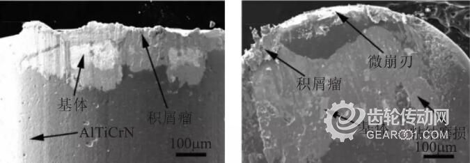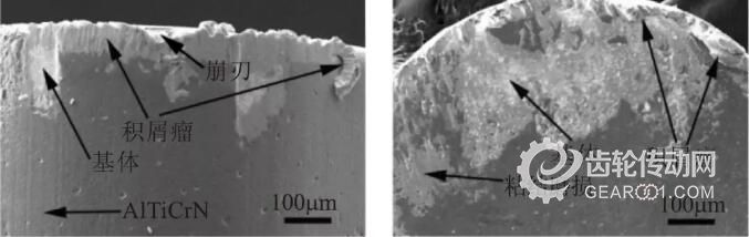 如圖9所示,當切削長度為60m時,兩種涂層刀具后刀面磨損量均增大,磨損方式均為磨粒磨損、粘結(jié)磨損和涂層脫落,但AlTiCrN涂層刀具有更加明顯的積屑瘤和微崩刃現(xiàn)象。