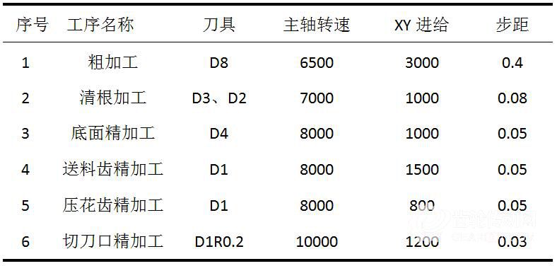 根據(jù)所用毛坯的形狀以及整體式KN95熔接齒模的結(jié)構(gòu)特點(diǎn),將其加工工序分為整體粗加工、清角加工、底面精加工、送料齒精加工、壓花齒精加工、切刀口精加工。各加工工序所用刀具以及加工參數(shù)如表2所示。