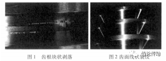 蝸桿通常與蝸輪配合使用組成交錯軸齒輪副,可作為減速裝置的重要傳動結構。為得到較高的傳動效率,蝸桿要求表面硬度和加工精度相對較高,若蝸桿熱處理和加工工藝不恰當,容易在蝸桿齒面形成裂紋,影響蝸桿齒面的疲勞強度。某批次蝸桿材料選用 17CrNiM06,是某動力傳動減速機的主要傳動部件,在磨齒加工過程中在其齒根、齒面發現多條不同程度的裂紋,大部分在粗磨工序出現裂紋,其中一件在精磨工序出現裂紋,裂紋主要表現為齒根塊狀剝落、齒面靠近齒根線狀裂紋及由齒根到齒頂散射的線狀裂紋形式,裂紋肉眼可見,觸感明顯,嚴重位置有爆裂現象,如圖1~ 2所示。