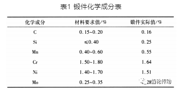 鍛件毛坯分析:(1)針對鍛件化學成分的排查,根據鍛件廠家提供的自查記錄及鍛件化學成分表,蝸桿化學成分符合 17CrNiM06技術要求,不存在超標情況,如表1所示,可排除鍛件化學成分超標B1。