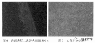 齒根未磨區域表面組織為:細針狀馬氏體+彌散顆粒狀碳化物+少量殘余奧氏體,碳化物級別:1級,馬氏體級別:2級,殘余奧氏體級別:2級,滿足技術要求。可排除滲碳淬火后金相組織超標B5。