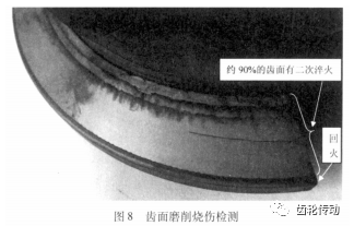 磨齒工藝參數不合理分析:按照GB/T17879—1999對蝸桿齒面進行侵蝕檢驗,觀察發現整個齒高方向,有約90%的區域呈白亮色,顯示二次淬火磨削燒傷特征,剩余10%齒面呈深灰色,顯示回火燒傷特征,如圖8所示。