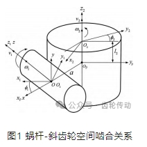 為保證蝸桿-斜齒輪的連續(xù)穩(wěn)定傳動(dòng),蝸桿和斜齒輪嚙合首先要滿足嚙合基本條件:(1)蝸桿法向模數(shù)和法向壓力角與斜齒輪法向模數(shù)和法向壓力角分別相等;(2)蝸桿導(dǎo)程角和斜齒輪螺旋角相等;(3)蝸桿和斜齒輪旋向相同。以上 3 個(gè)條件是齒面的幾何參數(shù)設(shè)計(jì)的基本條件,滿足這些條件并不能保證傳動(dòng)的連續(xù)進(jìn)行。在傳動(dòng)過程中,蝸桿和斜齒輪還可能發(fā)生齒面接觸干涉。為了分析蝸桿與斜齒輪之間的傳動(dòng)關(guān)系,首先需要建立空間嚙合坐標(biāo)系,作為蝸桿和斜齒輪的空間嚙合運(yùn)動(dòng)模型。
