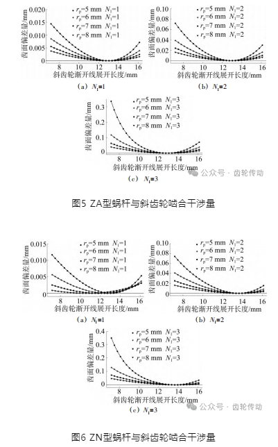 為了對(duì)比不同節(jié)圓半徑對(duì)齒面干涉量的變化情況,分別計(jì)算了頭數(shù)為1、2、3,節(jié)圓半徑為5 mm、6 mm、7 mm 和8 mm的蝸桿,與蝸桿完全共軛的斜齒輪(式 (14))與標(biāo)準(zhǔn)斜齒輪進(jìn)行比較。圖5和圖6分別為 ZA型蝸桿和ZN 型蝸桿的計(jì)算結(jié)果。圖中分別對(duì)比了相同蝸桿頭數(shù)、不同節(jié)圓半徑的蝸桿與標(biāo)準(zhǔn)斜齒輪的嚙合干涉量。由圖可知,ZA 型與 ZN 型蝸桿與斜齒輪的齒面干涉量變化規(guī)律基本一致,干涉量的大小也基本一致。