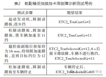 該 12 擋 AMT 奇數(shù)擋位時前副箱為低擋。由于高擋位時車速較高,換擋卡滯造成的危害加劇,本文以 11 擋時前副箱低擋換擋卡滯為例,故障診斷測試用例如表2所示。其中,ETC2_ TrmCurrGr 為當(dāng)前擋位,ETC2_TrmSelectedGr 為目標(biāo)擋位。