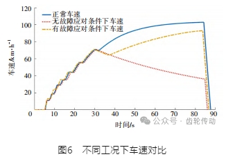 不同工況下車速、當(dāng)前擋位和目標(biāo)擋位對比結(jié)果如圖 6所示。由圖 6可知:正常換擋工況下,由于換擋離合器脫開等原因,車輛在由11擋升12擋時,車速先下降一段后持續(xù)正常提高;無故障應(yīng)對條件下?lián)Q擋工況中,在由11擋升12擋時,卡滯原因?qū)е聼o法正常換擋,車速持續(xù)降低,無法回到原有加速狀態(tài),將導(dǎo)致車輛最終停止;在故障應(yīng)對條件下,車輛在經(jīng)過 6 s的故障診斷時間后,車速雖然降低,但可以恢復(fù)到原有加速狀態(tài),之后車速變化趨勢與正常換擋工況類似。