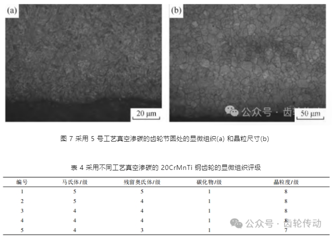 (2) 采用 1 和 2 號工藝真空滲碳、淬火和低溫回火的 20CrMnTi 鋼齒輪滲層殘留奧氏體較多; 采用 5 號工藝真空滲碳、淬火和低溫回火的 20CrMnTi 鋼齒輪滲層晶粒度為 7 級; 采用其余工藝真空滲碳、淬火回火的齒輪晶粒度為 8 級。