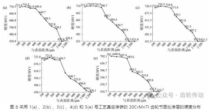 滲碳和淬火回火后工件的有效硬化層深度是指從表面到維氏硬度為 550 HV 處的垂直距離,是評定滲碳淬硬件熱處理質量的重要指標之一。采用五種工藝真空滲碳的齒輪節圓處滲層的硬度分布如圖 8 所示。圖 8 表明,隨著與表面距離的增大硬度下降,采用 1 ~ 4 號工藝真空滲碳的齒輪節圓處滲層硬度先上升后下降,這與含碳量的降低和殘留奧氏體的多少有關。采用五種工藝真空滲碳的齒輪節圓處的滲層深度分別為 0.884 mm、0.913 mm、0.878 mm、 0.925 mm 和 0.935 mm,表面硬度基本為 60 ~ 61 HRC(換算值) ,符合要求(58 ~ 62 HRC) 。