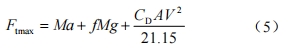 聯(lián)立式(2)-式(4)便可以計(jì)算出所需要達(dá)到的加速度約為 12.1 m/s2。此時(shí)賽車所需的最大驅(qū)動(dòng)力 Ftmax 為 4 723.4 N,其計(jì)算公式為