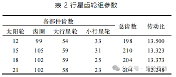 根據(jù)計(jì)算出的傳動(dòng)比取值區(qū)間,選擇出多組行星齒輪組的齒數(shù),如表 2 所示。