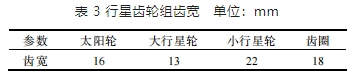 考慮到太陽輪為驅(qū)動(dòng)輪,其齒數(shù)越大強(qiáng)度越高;行星齒輪組的總齒數(shù)越小,其加工成本越低;傳動(dòng)比要盡量接近傳動(dòng)比上限,保證驅(qū)動(dòng)力。根據(jù)以上設(shè)計(jì)要求,確定行星齒輪組的齒數(shù)如表 2 第三組數(shù)據(jù)所示,同時(shí)確定行星齒輪組的齒寬,如表 3 所示。