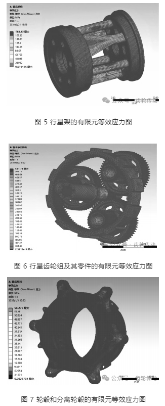 通過圖 5 最大等效應(yīng)力與零件對(duì)應(yīng)材料的屈服強(qiáng)度可知,對(duì)于采用 7075AL 為材料的零件安全系數(shù)均至少為 2.68,齒輪組中各個(gè)零件的安全系數(shù)也均超過 1.6,反映了零件結(jié)構(gòu)和材料的合理,同時(shí)也驗(yàn)證了參數(shù)計(jì)算階段結(jié)果的正確性。