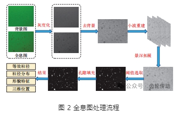采集到潤滑油中的顆粒全息圖后,需先對(duì)全息圖進(jìn)行一系列圖像處理才能獲取所需要的顆粒信息,其主要過程為去噪、小波重建、景深拓展、顆粒識(shí)別、孔隙填充等。全息圖處理具體流程如圖 2 所示。