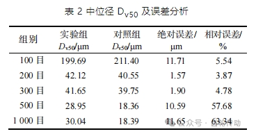 為了更好地比較兩種測(cè)量系統(tǒng)在粒徑測(cè)量結(jié)果上的差異,引入顆粒粒徑分析中典型的指標(biāo) Dv50 來進(jìn)行分析。Dv50 是指樣品的累計(jì)粒度分布百分?jǐn)?shù)達(dá)到 50%時(shí)所對(duì)應(yīng)的粒徑,也被稱為中位徑或中值粒徑,可以用來表示粉體的平均粒度。分別對(duì)實(shí)驗(yàn)組和對(duì)照組的數(shù)據(jù)計(jì)算中位徑 Dv50,結(jié)果見表 2。