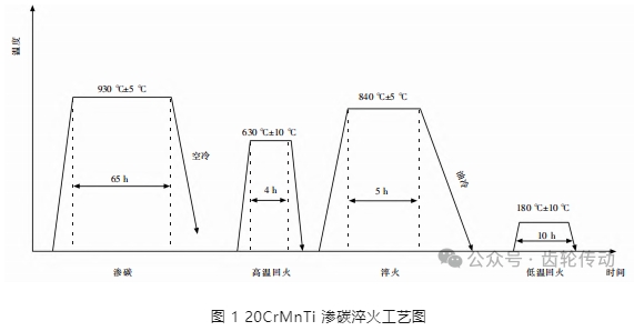 大齒輪(直齒外齒輪)模數(shù) m=16 mm。該齒輪的主要工藝流程:鍛造→熱(正火)→車→熱(正火)→車→鉆→鏜→滾(滾齒)→熱處理→車(切碳)→熱(淬火)→車→磨齒→探傷→插齒→鉗→入庫。齒輪鋼 20CrMnTi 的主要熱處理工藝如圖 1 所示。