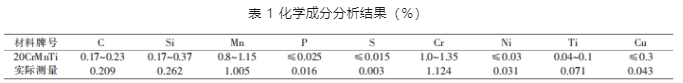 對大齒輪材料進行化學(xué)成分檢驗,其化學(xué)成分如表 1 所示。由表 1 可知,大齒輪材料各元素成分與 20CrMnTi 成分標(biāo)準(zhǔn)吻合較好。