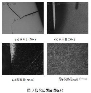 將該齒輪垂直于開裂齒面切開,制取齒寬方向的金相試樣,裂紋齒面金相組織如圖 3 所示。