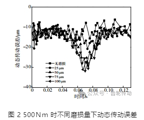 根據(jù)仿真得到的最初 0.13 s 的動(dòng)態(tài)傳動(dòng)誤差并繪制成相應(yīng)的曲線,圖 2 給出了在載荷為 500 Nm 條件下各單齒磨損量形成的傳動(dòng)誤差。