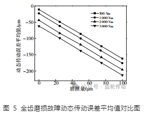 所有齒輪都達(dá)到相同的磨損量,不會(huì)出現(xiàn)單齒故障情況下磨損齒不受載荷作用的現(xiàn)象,這使得在全齒磨損故障條件下形成了更穩(wěn)定的動(dòng)態(tài)傳動(dòng)誤差。