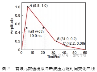 有限元數(shù)值模擬中壓力隨時間變化曲線如圖 2 所示,該幅值曲線為本工作所用激光沖擊強化的激光器參數(shù),即與實驗所用激光器參數(shù)一致。圖 2 中幅值曲線與峰值壓力 P0 的乘積為壓力隨時間的變化關(guān)系 P(t)。