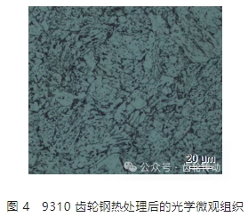 本工作以 9310 齒輪鋼為實驗材料,熱處理狀態(tài)為正火與回火相結(jié)合,9310 齒輪鋼熱處理后基本力學(xué)性能為:彈性模量 E=207 GPa,泊松比 v=0.3,密度 ρ=7.84 g/cm3 ,抗拉強度 σb≥1079 MPa。圖 4 為 9310 齒輪鋼熱處理后的微觀組織,可以看出,熱處理后 9310 齒輪鋼的組織由大量白色鐵素體、少量分布鐵素體之間的低碳馬氏體和呈顆粒狀分布在晶界和晶內(nèi)的碳化物組成。