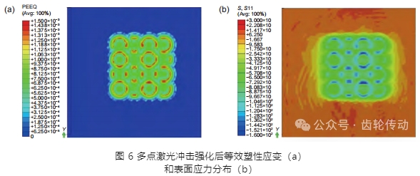 從零件全生命周期來看,激光沖擊強化工藝的作用主要是在不影響零件使用功能的前提下,盡可能提高零件疲勞壽命。一般認為,表面狀態(tài)變量如表面殘余應(yīng)力、顯微硬度等這些中間變量較好,即殘余應(yīng)力分布越均勻、殘余壓應(yīng)力越大、表面硬度越高,零件疲勞壽命越好。激光沖擊強化后材料表面狀態(tài)的評價可采用有限元數(shù)值模擬方法,也可采用實驗方法研究。本工作對殘余應(yīng)力分布均勻情況研究采用有限元數(shù)值模擬方法,對殘余壓應(yīng)力大小和顯微硬度研究采用實驗方法。有限元數(shù)值模擬的目的是評估采用的激光沖擊強化加工路徑方案形成的表面殘余應(yīng)力場空間分布是否均勻 。圖 6(a)為等效塑性應(yīng)變分布情況,圖 6(b)和(c)為應(yīng)力分量的表面和空間分布情況。可以看出,等效塑性應(yīng)變分布和應(yīng)力分布存在一定程度數(shù)值波動,但總體上相對均勻。對于空間應(yīng)力分布,實驗測試涉及材料的剝離問題以及剝離過程中殘余應(yīng)力釋放,獲得完整空間應(yīng)力分布需要較大實驗量。采用數(shù)值模擬方法,可在較少時間成本下獲得激光沖擊強化加工路徑方案的應(yīng)力空間分布規(guī)律。