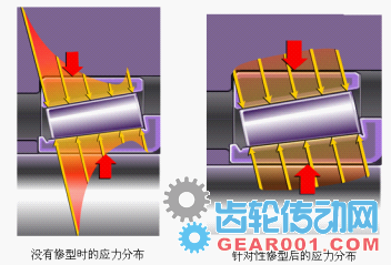 很多的齒輪傳動(dòng)設(shè)備都采用行星輪組件,因?yàn)樾行禽唫鲃?dòng)是動(dòng)力傳動(dòng)中最緊湊的解決方案,它的特點(diǎn)是扭矩大,尺寸小,重量輕并且效率高。為了提高重合度,降低噪音,很多的行星輪傳動(dòng)采用斜齒輪。斜齒行星輪產(chǎn)生的偏心以及變形要比直齒行星輪更加復(fù)雜,在這種應(yīng)用條件下,軸承往往容易偏心形成應(yīng)力集中。很顯然,這種偏心會(huì)對(duì)軸承造成不利的影響。針對(duì)這種情況,可以設(shè)計(jì)并采用具有針對(duì)性的軸承接觸型面,以有效避免應(yīng)力集中,如圖5所示。