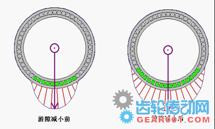 影響承載區(qū)的因素有軸承游隙,載荷大小,溫升等因素。對(duì)于設(shè)計(jì)者來(lái)說(shuō)比較容易控制的是軸承游隙,軸承游隙越小則承載區(qū)越大。因此一旦發(fā)現(xiàn)軸承承載區(qū)過(guò)小,則可以?xún)?yōu)先考慮采用減小游隙的方法,如圖7所示。