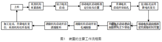 該裝置的動作主要是完成車用齒輪的安裝夾緊、自動化鉆孔去毛刺等加工動作。其動作流程如圖 1 所示。