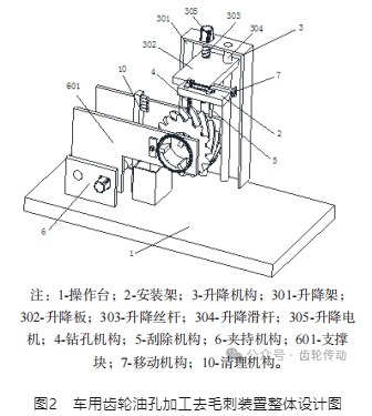 常見的齒輪油孔由于待加工齒輪的尺寸規(guī)格不同,油孔尺寸以及加工深度、加工精度要求也不同,因此加工時需考慮加工過程的裝夾機構(gòu)的通用性和加工尺寸的適應(yīng)性,刀具的轉(zhuǎn)速、進給速度需實現(xiàn)無極調(diào)速。同時,需考慮加工效率問題,油孔毛刺的去除工藝需在油孔加工完畢后自動高效去除并且該機構(gòu)的設(shè)計具備滿足不同孔徑和深度的孔的毛刺去除功能。因此,油孔加工裝置針對上述工藝問題而設(shè)計,主要適應(yīng)不同尺寸、型號的齒輪油孔加工并實現(xiàn)自動去毛刺功能。