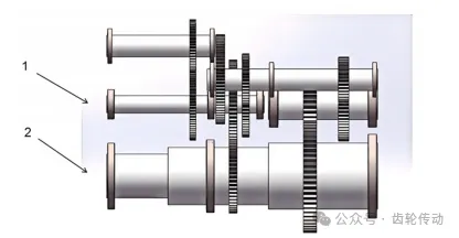 數(shù)控機(jī)床主傳動(dòng)系統(tǒng)如圖1所示。電動(dòng)機(jī)和齒輪箱利用懸掛點(diǎn)固定于齒輪箱一側(cè)構(gòu)架,電機(jī)軸和輸入的小齒輪之間用皮帶連接,兩者之間通過過盈配合方式連接在一起,輸入小齒輪與輸入大齒輪嚙合,輸入大齒輪通過固連接方式連接在軸2。通過軸2的齒輪與其他軸及齒輪進(jìn)行次級(jí)嚙合,經(jīng)過多次嚙合動(dòng)力傳遞實(shí)現(xiàn)數(shù)控機(jī)床主傳動(dòng)系統(tǒng)的低速、中速、高速3種工況。