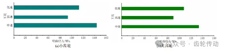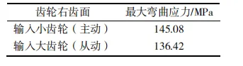 將實(shí)測(cè)的基本參數(shù)和表1數(shù)據(jù)代入式(2)得到彎曲應(yīng)力,結(jié)果如表2所示。通常在起步階段,彎曲應(yīng)力最大。因此針對(duì)不同的啟動(dòng)速度(1500,2800,10000r/min),目標(biāo)為得到最大彎曲應(yīng)力,在建立的齒輪模型載荷譜靜態(tài)進(jìn)行計(jì)算。這樣能夠保證齒輪在各種工況下均能正常工作,可以得到不同啟動(dòng)速度下的齒輪載荷譜,并進(jìn)一步計(jì)算出對(duì)應(yīng)的最大彎曲應(yīng)力。用Romax Designer模擬仿真如圖4所示。