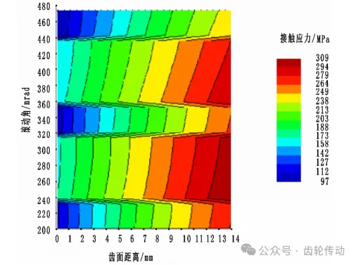 由表3可知,直齒輪的接觸線長(zhǎng)度約為75mm,能夠滿足平穩(wěn)運(yùn)行的基本要求。根據(jù)圖5所示的最大接觸應(yīng)力,代入相應(yīng)的參數(shù)和表1數(shù)據(jù),可得表4接觸應(yīng)力數(shù)據(jù),經(jīng)過仿真模擬得到的結(jié)果如圖6所示。圖6橫軸為齒寬,縱軸為齒輪嚙合的滾動(dòng)角。從齒輪齒頂與齒根接觸點(diǎn)的結(jié)果發(fā)現(xiàn),在大、小齒輪嚙合的過程中,存在偏載現(xiàn)象,造成振動(dòng)噪音的同時(shí),也使齒輪嚙合時(shí)產(chǎn)生沖擊。模型最大接觸應(yīng)力如表4所示。由表4可知,得到安全系數(shù)為1.37,容許最大范圍內(nèi)接觸應(yīng)力為550MPa,容許最大范圍內(nèi)彎曲應(yīng)力為150MPa。考慮整個(gè)機(jī)床傳動(dòng)系統(tǒng)構(gòu)件有變形的容錯(cuò)量,此次運(yùn)行結(jié)果符合理論設(shè)計(jì)值的范圍,齒輪各個(gè)應(yīng)力值均沒有超過許用值,齒輪壽命符合設(shè)計(jì)預(yù)期。綜合分析圖5和表4的結(jié)果可以得出,在偏載的情況下,齒輪的設(shè)計(jì)符合安全和壽命的要求,沖擊問題以及偏載現(xiàn)象可能帶來振動(dòng)噪聲。