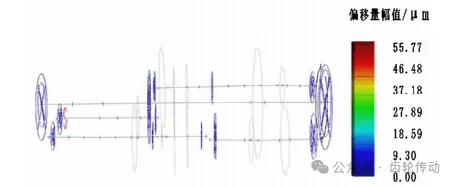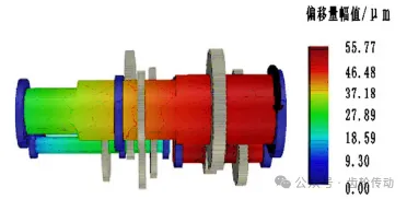整體模型在1500r/min工況下,對(duì)軸1、軸2的偏移變形進(jìn)行仿真分析,結(jié)果如圖7,8所示。由圖8可知,外載荷、床身以及齒輪嚙合共同作用下,軸發(fā)生偏移,最大偏移量達(dá)55.77µm,偏移主要出現(xiàn)在靠近齒輪一側(cè)的齒輪軸端。變形的不均勻?qū)е慢X輪右側(cè)嚙合而左側(cè)分離,加重齒輪的偏載,可能加速齒輪的損壞,也是機(jī)床工作不穩(wěn)定和產(chǎn)生振動(dòng)的主要原因。因此,在優(yōu)化設(shè)計(jì)中需采取措施平衡載荷分布,減少偏載對(duì)齒輪的不利影響,如調(diào)整床身結(jié)構(gòu)、參數(shù),增強(qiáng)齒輪支撐等。