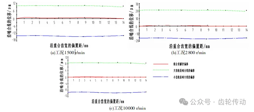 由于在機(jī)床齒輪傳動(dòng)系統(tǒng)中軸承、軸和箱體存在形變,得到嚙合錯(cuò)位量計(jì)算結(jié)果如表5所示,齒輪嚙合錯(cuò)位量如圖9所示。由表5可知,啟動(dòng)速度為1500,2800,10000r/min時(shí),存在最大嚙合錯(cuò)位量。圖9中虛線代表大齒輪沿嚙合線的位移錯(cuò)位量,點(diǎn)劃線代表小齒輪沿嚙合線的位移錯(cuò)位量,直線代表小齒輪與大齒輪的輪輻組合位移。由于變形的影響,沿著齒寬方向,齒輪右側(cè)接觸,左側(cè)有分離趨勢(shì),但是偏載不嚴(yán)重。