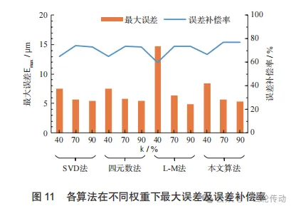 為了進一步比較各算法在最優權重下的補償效果,將各算法在權重70%時最終補償后的的平均誤差