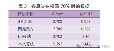 精配準后,將基于SVD法、四元數法、L-M法和本文算法進行配準的ICP迭代法的最終誤差補償結果進行分析,根據式(18)給出了各算法模型權重分別為40%、70%和90%時的誤差補償數據結果,并得出各算法10次獨立運算時間的均值,如表2所示。由表可得,各算法在權重k為70%時,補償效果最佳,且本文算法相較于SVD法、四元數法和L-M法進行ICP迭代補償后的最高誤差補償率分別提升了3.09%、3.10%和3.12%。權重k為70%時,在粗配準階段,SVD 法、 四元數法、L-M法和本文算法的最大誤差由補償前的22.11μm分別補償至 5.90、6.35、8.72 和5.87μm,再進一步進行精配準補償至5.67、5.79、6.38和5.64μm,測量齒面與理論齒面對應點平均誤差從10.34μm分別補償至2.71、2.70、2.70和2.38μm;本文算法相比于其他3種算法平均耗時增加了0.14、0.08和0.18s, 這是由于運行算法的過程中需要調用工具箱Sedumi求解。