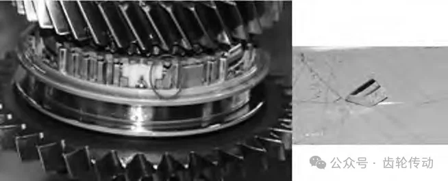 同步器齒轂零件的材料為粉末冶金 SIRON P725, 采用壓制和燒結工藝成型。在壓制過程中將粉末放入相應的模具進行塑形,并通過壓力機成型。經過高溫,保壓和冷卻等燒結工藝處理,保證了齒轂的使用強度。在變速器的整車耐久試驗中,試驗出現異常,將4/R檔同步器拆解后,發現齒轂斷裂一小塊碎片,如圖1所示。