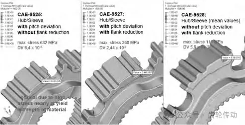 為了驗證減薄的齒轂齒面是否有效,將齒轂齒套有累計誤差但是齒轂沒有齒面減薄,齒轂齒套有累計誤差也有齒面減薄,齒轂齒套沒有累計誤差有齒面減薄這三種狀態進行CAE分析,如圖7所示。