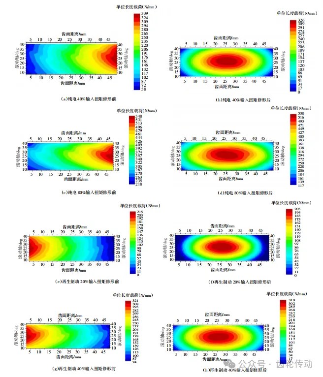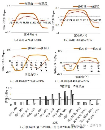 傳遞誤差:圖5(a)~(d)為修形前、后純電40% 、80%工況、再生制動(dòng)20%、40%工況遞誤差波動(dòng)情況,從波動(dòng)曲線可以看出,修形后沿嚙合線方向上的位移有一定的降低,而且波動(dòng)量有所降低,且曲線變得更加平滑、規(guī)律性更加強(qiáng),齒輪傳動(dòng)過(guò)程中更加平穩(wěn)。圖5(e)為修形前后各工況扭矩下傳遞誤差峰峰值變化情況,修形前后各工況下傳遞誤差峰峰值均有不同程度的降低,純電30%~80%工況最為顯著,純電30%~80%工況為該減速器的常用工況,見(jiàn)圖5(e)。根據(jù)經(jīng)驗(yàn),傳遞誤差≤1μm,該修形方案滿足技術(shù)要求,達(dá)到預(yù)期的效果。