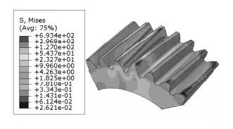 較常規齒的693.4MPa,如圖3(b)所示,降低了27.76%,均未超屈服極限。